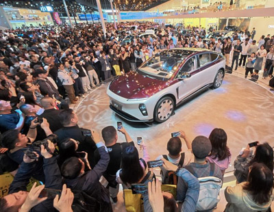 9月26日,在山东省青岛爱迪学校,学生在长卷上绘画。