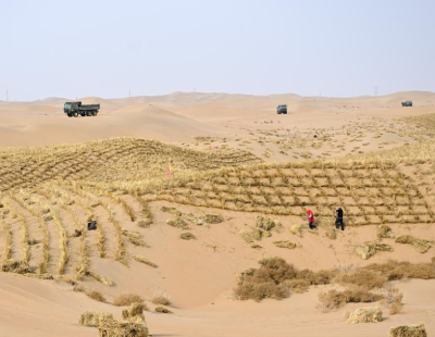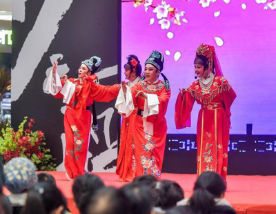 1月10日,浙江杭州一家沉浸式非遗体验空间内,游人体验皮影戏、花灯等年味非遗文创。图为游人观赏泥塑作品。中新社记者 肖健摄