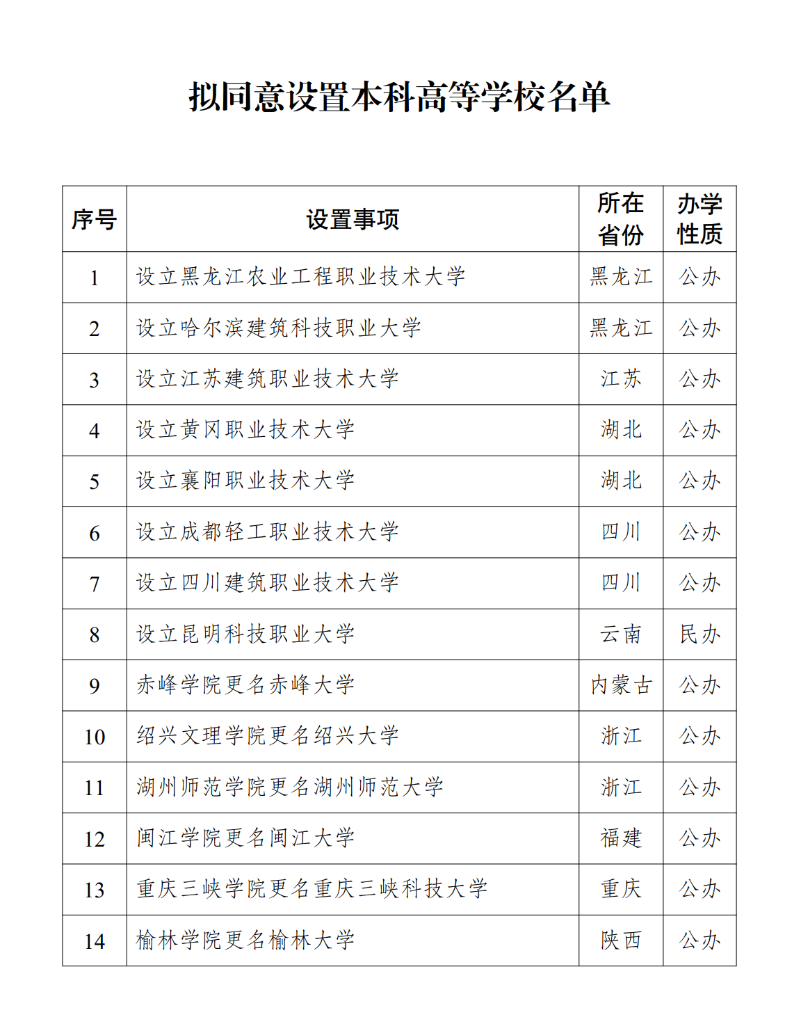 教育部拟同意设置黑龙江农业工程职业技术大学等14所本科高等学校