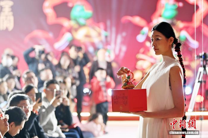 图为模特展示以“铜奔马”为主题的文创产品马财神摆件。中新社记者 九美旦增 摄
