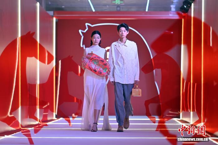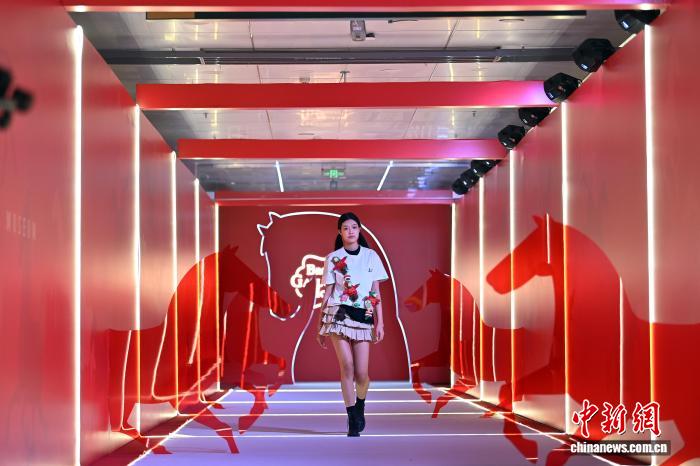 图为以“铜奔马”为主题的绿马人偶T台走秀吸引现场嘉宾。中新社记者 九美旦增 摄