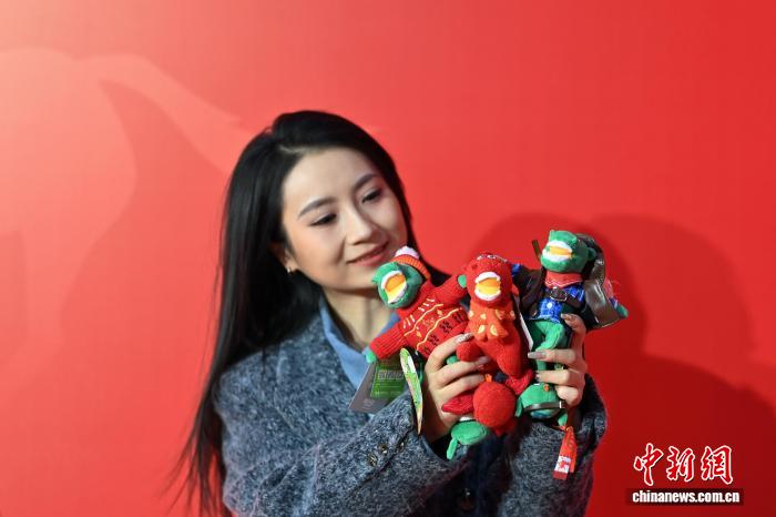 图为嘉宾展示当晚首发的“红运当头马”“本命年马”“西部马仔”三款毛绒玩具。中新社记者 九美旦增 摄