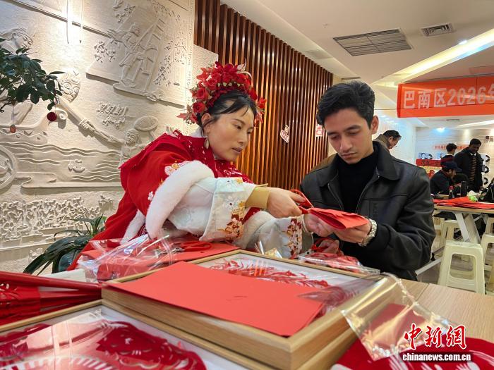 2月3日,新春佳节临近,年味渐浓。来自印度尼西亚、摩洛哥、孟加拉国等10余个国家的国际留学生走进重庆市巴南区,通过学唱山歌、写“福”字、打糍粑、磨豆花等方式,在传统文化与烟火香气中,感受中国新春的喜庆氛围,近距离感受独特年味。图为国际留学生学习剪窗花。中新网记者钟旖 摄
