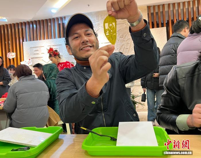 2月3日,新春佳节临近,年味渐浓。来自印度尼西亚、摩洛哥、孟加拉国等10余个国家的国际留学生走进重庆市巴南区,通过学唱山歌、写“福”字、打糍粑、磨豆花等方式,在传统文化与烟火香气中,感受中国新春的喜庆氛围,近距离感受独特年味。图为国际留学生展示巴南树叶雕刻画,叶脉间是“熊猫”图案。中新网记者钟旖 摄