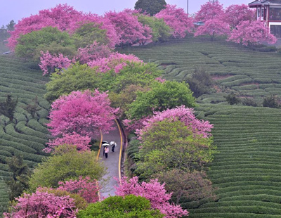 2025年4月10日,安徽省芜湖市无为市昆山镇三公山茶叶种植基地,千亩高山野生杜鹃在翠绿的茶园之间绚丽绽放,美轮美奂,美不胜收