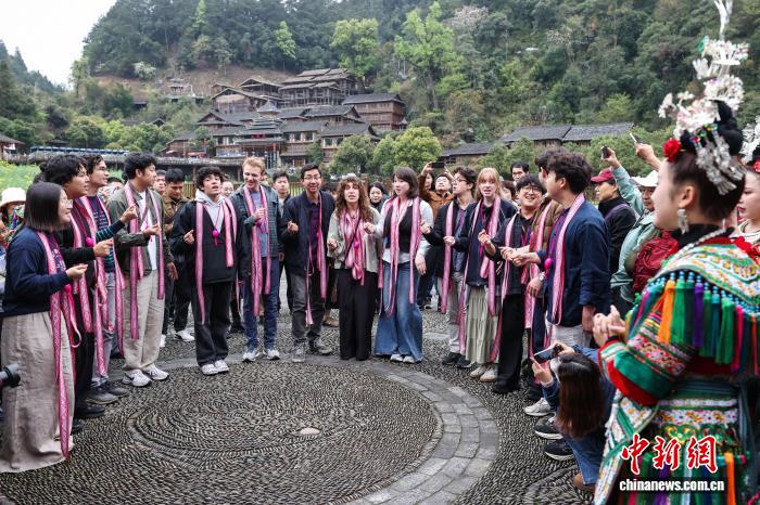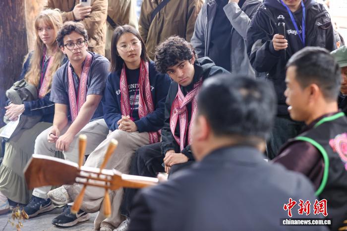3月23日,耶鲁大学Whiffenpoofs合唱团在肇兴侗寨听侗族大歌。当日,由北京大鸾翔宇慈善基金会邀请的“大鸾和鸣—耶鲁大学Whiffenpoofs合唱团2026中国公益行”,走进贵州省黔东南州黎平县肇兴侗寨了解侗族文化,沉浸式学习侗族乐器并体验侗族民俗。据悉,该合唱团成立于1909年,以其独特的现代无伴奏和声与高度专业化的巡演体系成为美国高校文化中极具代表性的音乐名片。中新社记者瞿宏伦 摄