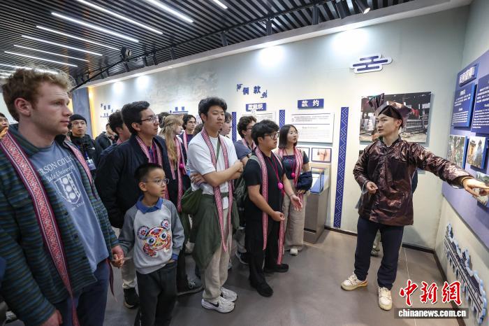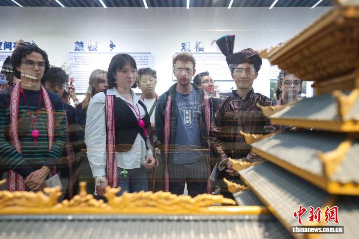 3月23日,耶鲁大学Whiffenpoofs合唱团在肇兴侗寨文化展示中心了解侗族文化。中新社记者 瞿宏伦 摄