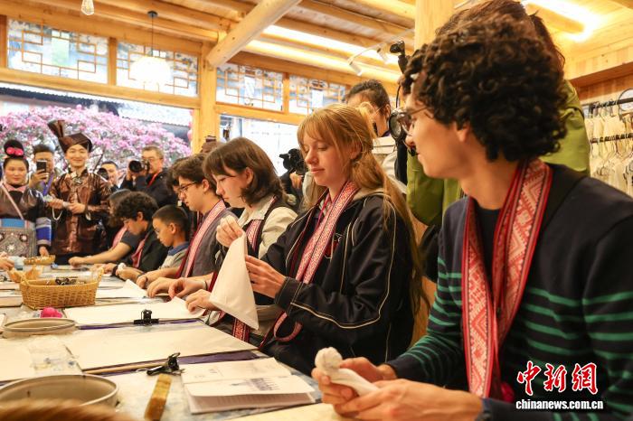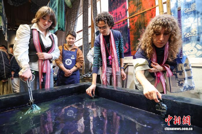 3月23日,耶鲁大学Whiffenpoofs合唱团成员在肇兴侗寨体验制作扎染。中新社记者 瞿宏伦 摄