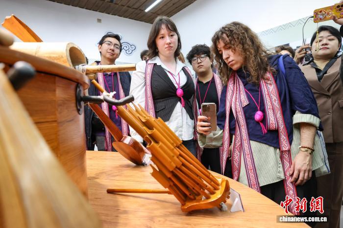 3月23日,耶鲁大学Whiffenpoofs合唱团成员在拍摄侗族乐器。中新社记者 瞿宏伦 摄
