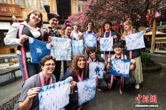 3月23日,耶鲁大学Whiffenpoofs合唱团在肇兴侗寨体验制作扎染。中新社记者 瞿宏伦 摄