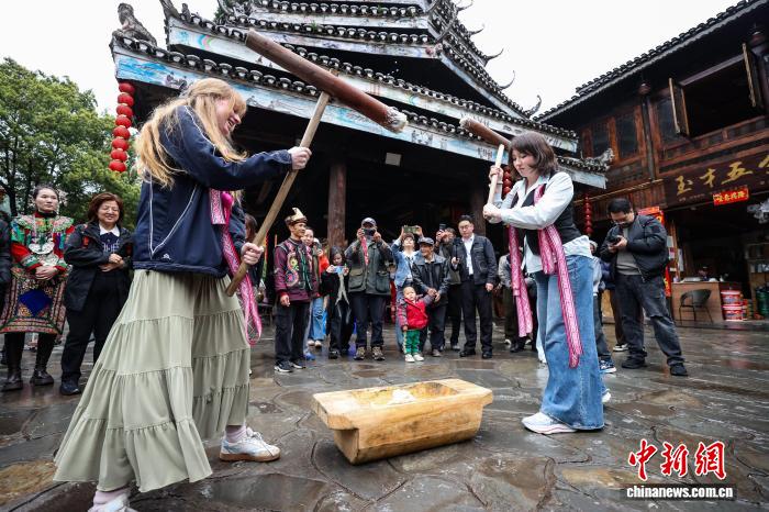 3月23日,耶鲁大学Whiffenpoofs合唱团成员在肇兴侗寨体验打糍粑。中新社记者 瞿宏伦 摄