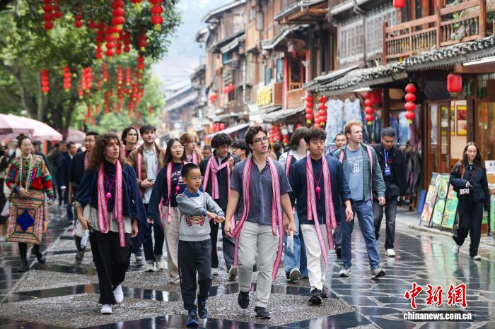 3月23日,耶鲁大学Whiffenpoofs合唱团在肇兴侗寨参观。中新社记者 瞿宏伦 摄