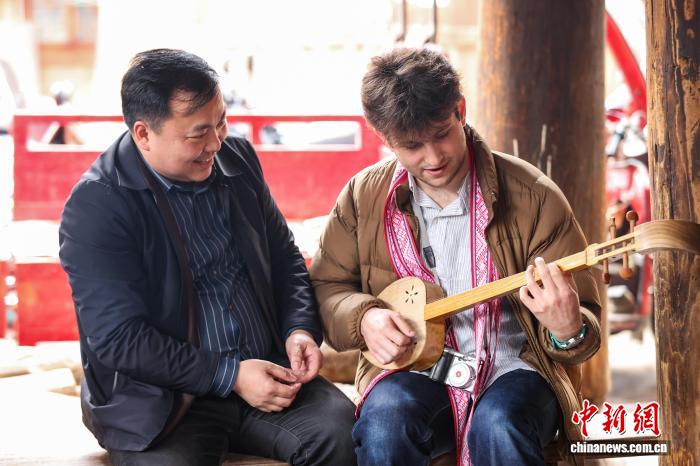 3月23日,耶鲁大学Whiffenpoofs合唱团成员在肇兴侗寨学习侗族琵琶。中新社记者 瞿宏伦 摄