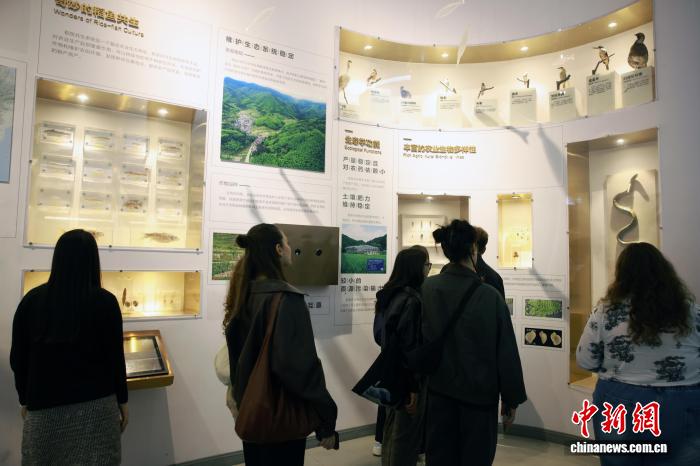 4月12日,浙江省欧美同学会组织浙江大学中国学留学生走进浙江丽水青田方山乡,实地探访首批全球重要农业文化遗产——青田稻鱼共生系统,近距离感受千年农耕智慧的活态传承与保护实践。图为留学生在稻鱼共生系统博物馆驻足观看瓯江水生生物标本。中新社记者孙杨洋 摄