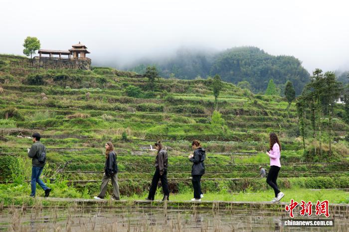 4月12日,浙江省欧美同学会组织浙江大学中国学留学生走进浙江丽水青田方山乡,实地探访首批全球重要农业文化遗产——青田稻鱼共生系统,近距离感受千年农耕智慧的活态传承与保护实践。图为留学生参观稻鱼共生核心保护区。中新社记者孙杨洋 摄