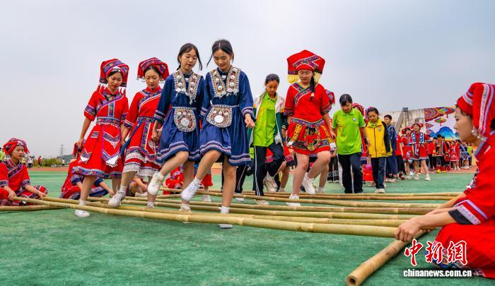 图为学生们在跳竹竿舞和抛绣球。高如金 摄