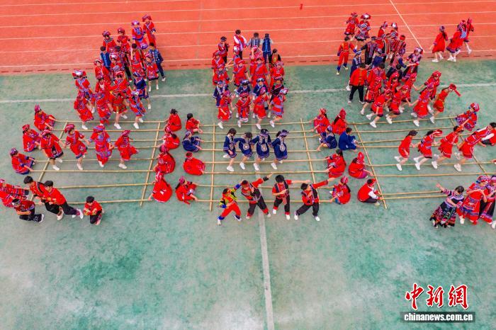 图为学生们跳竹竿舞。(无人机照片)高如金 摄